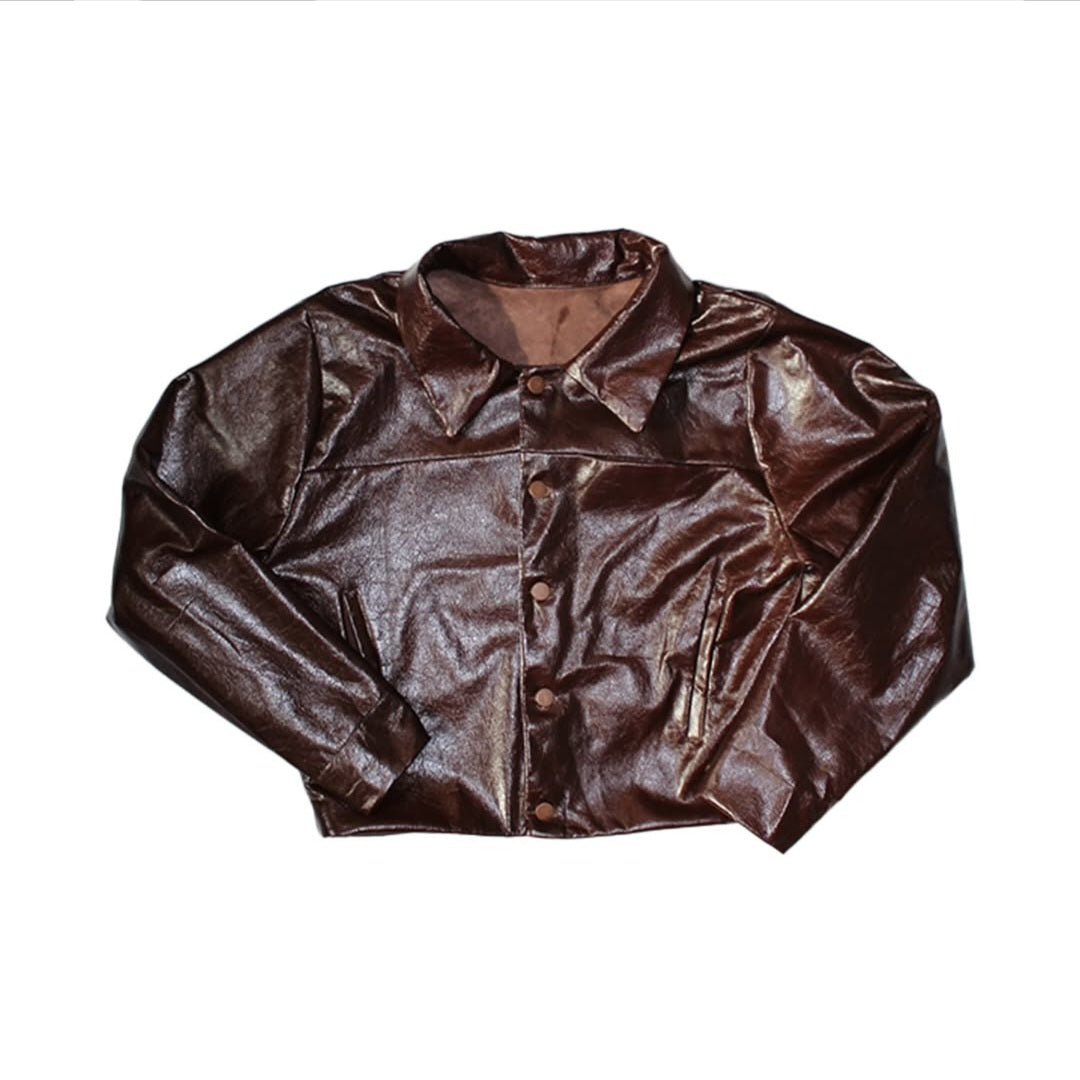 Calf leather jacket (pants not shown) made with 100% calf leather and copper metal buttons. Boxy work jacket fit